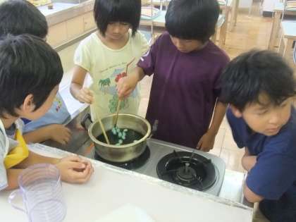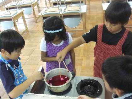 今週はそのまゆを使って、創作活動をしました。まず、繭玉を染めているところを紹介します。