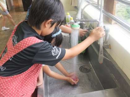 今週はそのまゆを使って、創作活動をしました。まず、繭玉を染めているところを紹介します。
