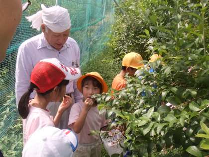毎年恒例の中村農園さんでのブルーベリー摘みです。子供たちは楽しみにしている行事です。摘んだブルーベリーを給食室ではジャムにして今年は、ブルーベリーヨーグルトにかけて食べました。