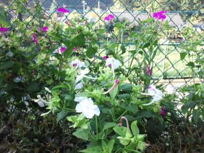 今朝は、雲一つない澄み切った素晴らしい空の中、オシロイバナもきれいに咲いていました。