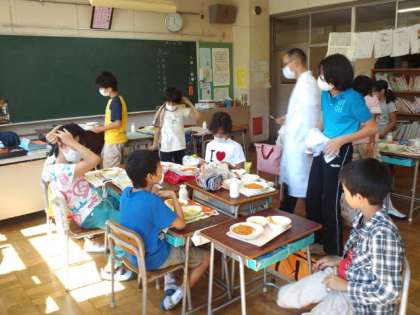 5・6年で一緒に給食を食べています。