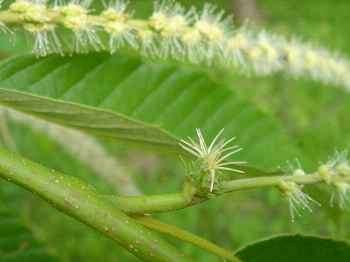 ☆今はクリの花があちこちにさいています。クリはお花とめ花があります。写真の真ん中にあるのがめ花。上にたくさん見えるのがお花です。め花は一つですが、お花はたくさんあります。