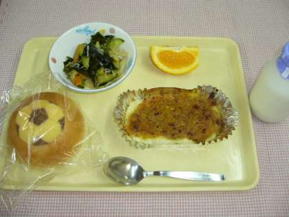 今日の給食は、サッカーボールパン・ポテトとミートの重ね焼き・わかめサラダ・くだもの(バレンシアオレンジ1/4)・牛乳です。2010年サッカーワールドカップ南アフリカ大会がついに始まりました。昨日の夜中には、日本対カメルーンの試合も行なわれ、1-0で日本の勝利!今日のサッカーボールパンがよりおいしく感じられました。