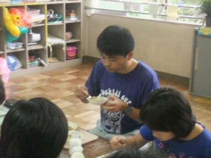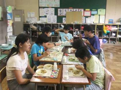 視聴覚室での学習の後は、ゲストティーチャーの方とふれあい給食でした。