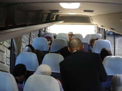 今日は、五年生が社会科見学です。今バスに乗り、出発します。