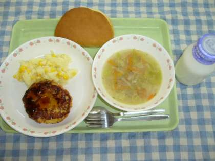 今日の給食は、サンドパン、和風照り焼きハンバーグ、コーンポテト、オニオンスープ、牛乳です。和風照り焼きハンバーグには、しっかり水を絞った木綿豆腐がたっぷり入っています。鶏のひき肉と豆腐でヘルシーですがボリュームのあるハンバーグになりました。甘辛のしょうゆダレとの相性もバッチリです!
