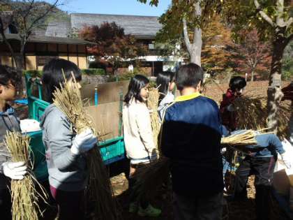 一昨日、五年生が自分たちが育てた稲を脱穀ともみすりをしに夕やけ小やけふれあいの里に出かけてきました。その時の様子です。