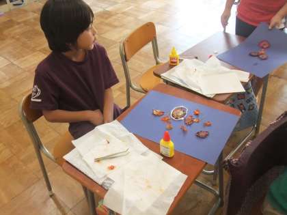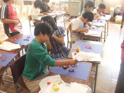 先日3年生が展覧会の作品作りをしていました。まゆの糸を使い素晴らしい作品を作っていました。