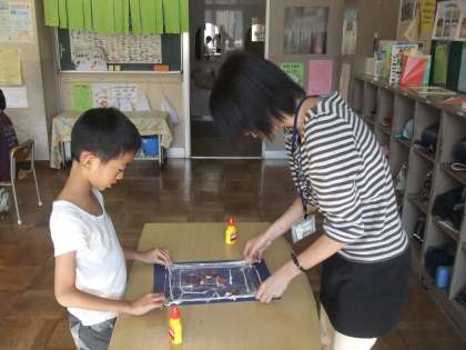 先日3年生が展覧会の作品作りをしていました。まゆの糸を使い素晴らしい作品を作っていました。