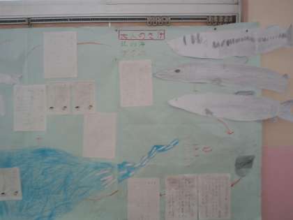 2年生は国語の教科書にある「さけの一生」の説明文を学習していました。その時に子供たちが書いたさけの絵などが廊下に掲示してありますので紹介します。