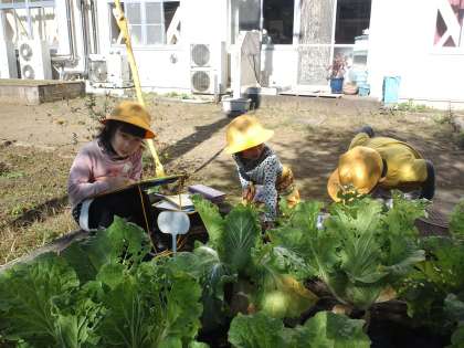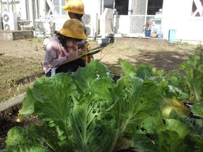 先日、1年生が畑に植えた白菜を観察していました。その後、しばらくして白菜を収穫して家で白菜を食べたようです。白菜食べた?と聞くと、「おいしかったよ!」という声がたくさん聞かれました。