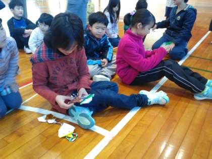 先週の集会は宝探し集会でした。体育館に集会委員さんたちが折り紙で作った宝を隠して、見つけます。縦割り班対抗でやりました。