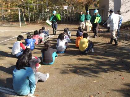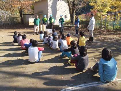 2学期に紹介できなかった林業体験を紹介します。この学習は毎年、5,6年生が間伐を森林組合の方々と一緒にやっている体験です。今年度は11月21日に行いました。学校のすぐ北側の山の中の杉の木を間伐しました。はじめに、お話をしてもらってから山の中に入りました。