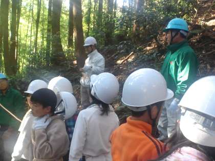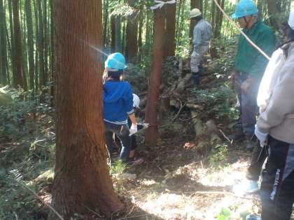 2学期に紹介できなかった林業体験を紹介します。この学習は毎年、5,6年生が間伐を森林組合の方々と一緒にやっている体験です。今年度は11月21日に行いました。学校のすぐ北側の山の中の杉の木を間伐しました。はじめに、お話をしてもらってから山の中に入りました。