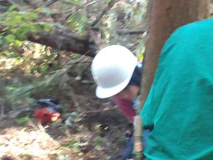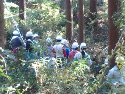 2学期に紹介できなかった林業体験を紹介します。この学習は毎年、5,6年生が間伐を森林組合の方々と一緒にやっている体験です。今年度は11月21日に行いました。学校のすぐ北側の山の中の杉の木を間伐しました。はじめに、お話をしてもらってから山の中に入りました。