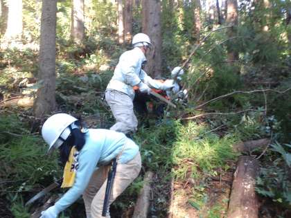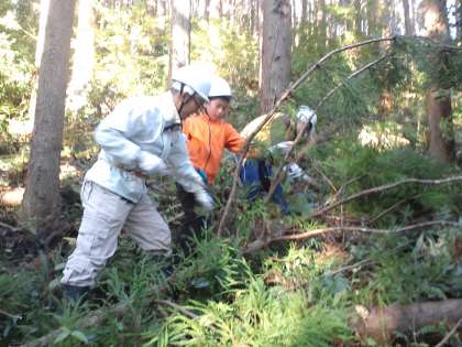 2学期に紹介できなかった林業体験を紹介します。この学習は毎年、5,6年生が間伐を森林組合の方々と一緒にやっている体験です。今年度は11月21日に行いました。学校のすぐ北側の山の中の杉の木を間伐しました。はじめに、お話をしてもらってから山の中に入りました。