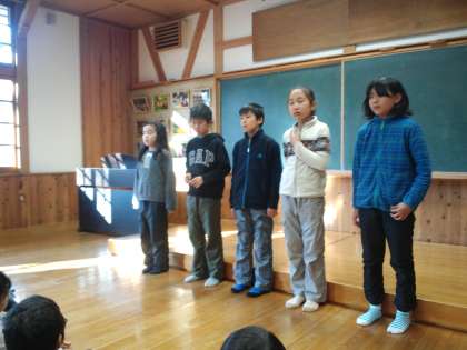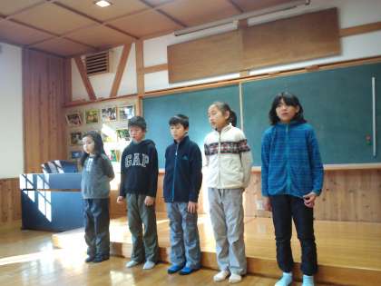 今日は3学期の始業式でした。校長先生のお話、児童代表の話は4年生、そして、校歌、そして、生活指導主任の先生から「1月の生活目標」についての話、体育主任の先生からは「ボール」の使い方、副校長からは「ヤマメの放流」についての話がありました。