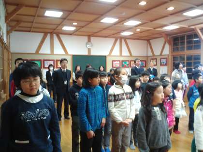 今日は3学期の始業式でした。校長先生のお話、児童代表の話は4年生、そして、校歌、そして、生活指導主任の先生から「1月の生活目標」についての話、体育主任の先生からは「ボール」の使い方、副校長からは「ヤマメの放流」についての話がありました。