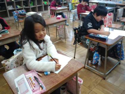 今日の授業の様子です。今日は書き初め展に向けて授業が行われていたり、お正月遊びに取り組んでいたりしていました。