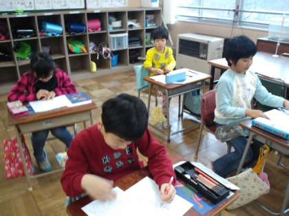 今日の授業の様子です。今日は書き初め展に向けて授業が行われていたり、お正月遊びに取り組んでいたりしていました。
