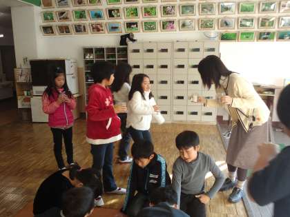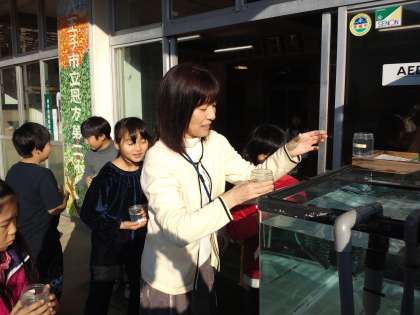 始業式の日に、冷蔵庫の中で飼っていたヤマメの稚魚を大きな水槽に移しました。その時の様子です。