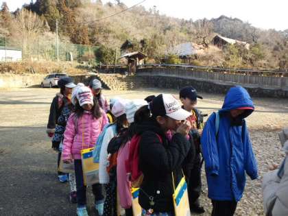 今日は二年生が生活科見学に行きました。恩方郵便局に見学に行きます。バス停でバスを待っているところです。