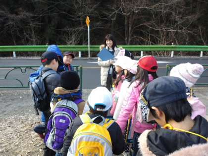 今日は二年生が生活科見学に行きました。恩方郵便局に見学に行きます。バス停でバスを待っているところです。