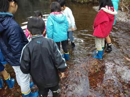 卵から育て、大きくなったヤマメを学校の前の醍醐川に放流しました。飼育委員会の子供たちと一緒に8尾放流しました。5尾は観察するために学校の中くらいの水槽にいます。