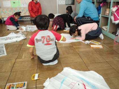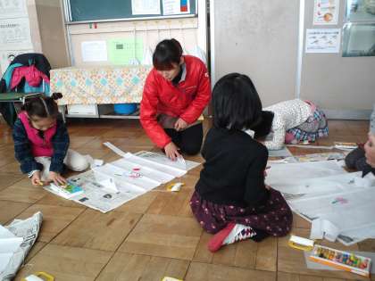 今週、八王子市内の保育園の先生と園児1名が本校の1年生と交流しました。初めに、凧揚げの凧作り、そしてそのあと、凧揚げをしました。1年生の子供たちは園児にやさしく語りかけたりしてほほえましかったです。