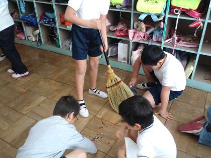 今週の火曜日にダスキンさんをゲストティーチャーにお迎えして、1・2年生にお掃除のやり方を教えてもらいました。「お掃除教室」です。ほうきや塵取りの使い方、雑巾で机をふくふき方、雑巾の絞り方などです。1・2年生の子供たちはみんな一生懸命に取り組んでいました。とても立派でした。