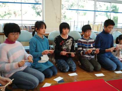 先日、一年生と六年生が恒例の茶道教室を行いました。ゲストティーチャーは、もと恩二小の先生です。いつもは視聴覚室でおこなっているのですが、雪の影響で、家庭科室でおこないました。
