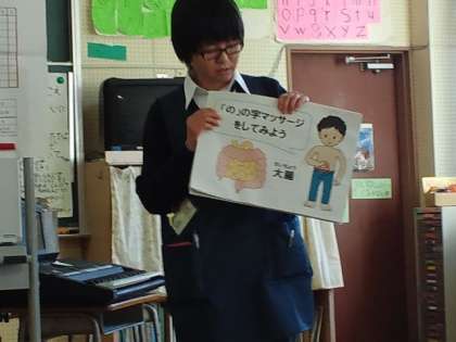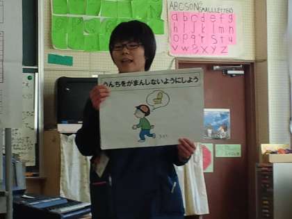 今日の保健朝会では、養護教諭より、初めに「3学期の保健目標について」「1年間の健康の振り返り」について話がありました。1年間の健康の振り返りの中で子供たちが一番できていないのが「毎日うんちをする」という項目です。そこで、養護教諭から「毎日ウンチをすることが健康に良いこと、毎日ウンチをする習慣をつけるにはどうしたらよいか」の話がありました。