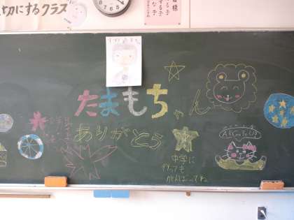 今週の火曜日、6年生とのお別れ給食会がありました。黒板に、6年生の似顔絵と感謝の言葉や卒業を祝う言葉が書いてありました。