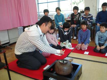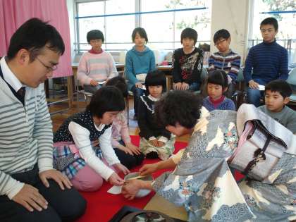 先日、一年生と六年生が恒例の茶道教室を行いました。ゲストティーチャーは、もと恩二小の先生です。いつもは視聴覚室でおこなっているのですが、雪の影響で、家庭科室でおこないました。