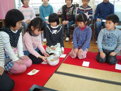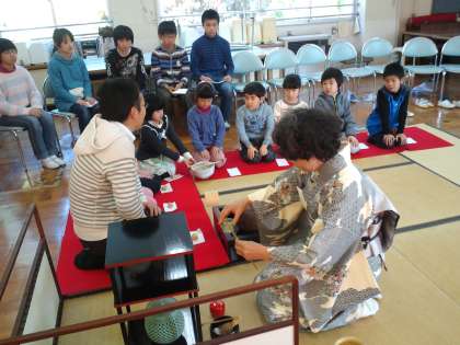 先日、一年生と六年生が恒例の茶道教室を行いました。ゲストティーチャーは、もと恩二小の先生です。いつもは視聴覚室でおこなっているのですが、雪の影響で、家庭科室でおこないました。