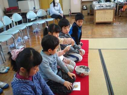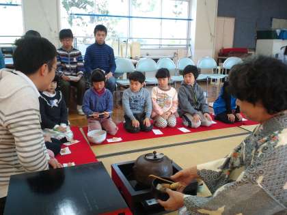 先日、一年生と六年生が恒例の茶道教室を行いました。ゲストティーチャーは、もと恩二小の先生です。いつもは視聴覚室でおこなっているのですが、雪の影響で、家庭科室でおこないました。