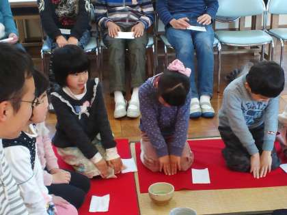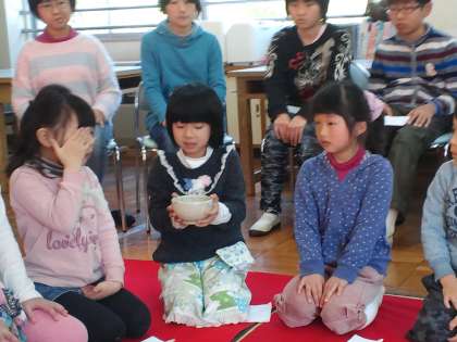 先日、一年生と六年生が恒例の茶道教室を行いました。ゲストティーチャーは、もと恩二小の先生です。いつもは視聴覚室でおこなっているのですが、雪の影響で、家庭科室でおこないました。