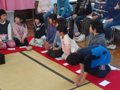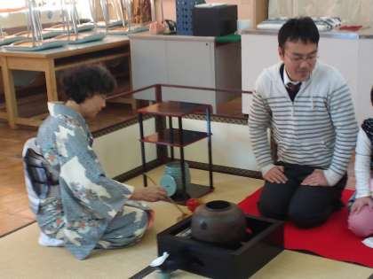 先日、一年生と六年生が恒例の茶道教室を行いました。ゲストティーチャーは、もと恩二小の先生です。いつもは視聴覚室でおこなっているのですが、雪の影響で、家庭科室でおこないました。