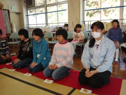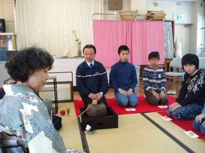 先日、一年生と六年生が恒例の茶道教室を行いました。ゲストティーチャーは、もと恩二小の先生です。いつもは視聴覚室でおこなっているのですが、雪の影響で、家庭科室でおこないました。