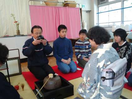 先日、一年生と六年生が恒例の茶道教室を行いました。ゲストティーチャーは、もと恩二小の先生です。いつもは視聴覚室でおこなっているのですが、雪の影響で、家庭科室でおこないました。