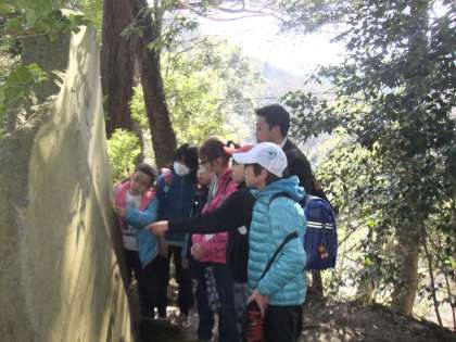 その中村雨紅のことを語り継いでいる地域の方導そ愛子さん宅に4年生の子供たちが「中村雨紅」のお話を聞きに行きました。導そさんのお宅に行く前に「宮尾神社の歌碑」を見に行きました。