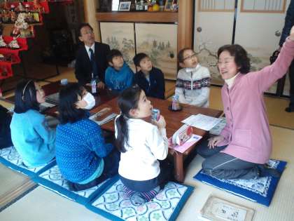 その中村雨紅のことを語り継いでいる地域の方導そ愛子さん宅に4年生の子供たちが「中村雨紅」のお話を聞きに行きました。導そさんのお宅に行く前に「宮尾神社の歌碑」を見に行きました。