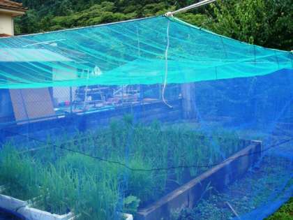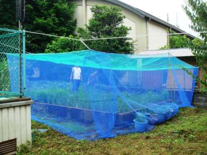 田んぼの稲が育っています。鳥よけのネットが張られました。