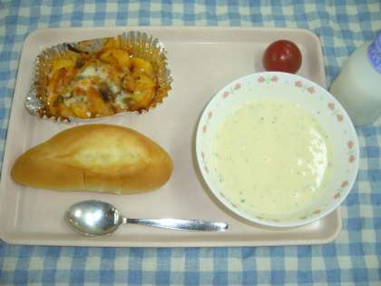 今日の給食は、ソフトフランスパン・ポテトのピザ焼き・コーンポタージュ・ミディートマト・牛乳です。コーンポタージュは、リクエスト給食の集計をしているときに、1年生のほとんどの児童が書いていました。今回は、残念ながらベスト3には入りませんでしたが1年生のリクエストをうけて、こんだてに取り入れました。