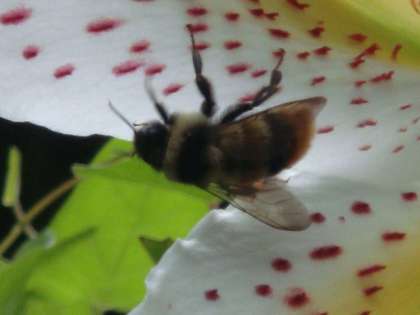 ☆この写真は、先日の上案下のあるおうちのヤマユリの花に来ていたものです。花のまわりをはなれずに、動き回っていました。同じ仲間に、全体がやや黄色っぽいトラマルハナバチや黒っぽいクロマルハナバチなどがいます。
