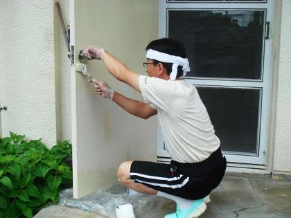 にわか雨が止んで、給食室でもドアのワイヤーかけとペンキ塗りをしていました。