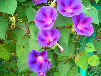 ☆このアサガオの葉っぱをよく見てください。形がちがうのがわかりますか。日本のアサガオはほこ形ですが、これは丸い葉なので、マルバアサガオといいます。