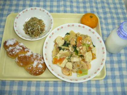 今日のこんだては、あげパン(さとう味)・えび豆腐・ごまめナッツ・くだもの(冷凍みかん)・牛乳です。久々に登場のあげパンは大人にも子どもにも人気が有ります。欠席の児童分の争奪戦が行われたクラスもあるようです。