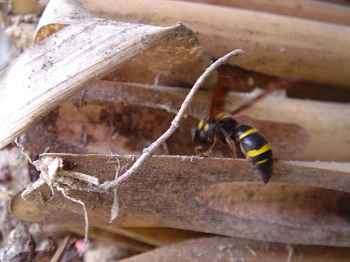 ☆写真は、ドロバチ科のオオフタオビドロバチというハチです。このハチはアオムシを集めてきます。ふかした幼虫はそのアオムシを食べて大きくなるそうです。写真をよく見ると竹のつつがわかりますか。この竹がこのハチの巣になるのです。