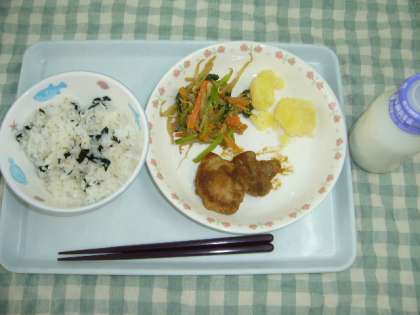 15日のこんだては、わかめごはん・ポークソテー・ごま和え・粉ふきいも・牛乳でした。いつもは、コンベクションオーブンで焼くポークソテーを何回かに分けてフライパンで焼きました。オーブンとは違い手間も時間もかかりますが、焼きあがったお肉はとってもジューシーでした。